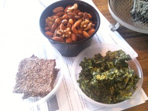 I also made some Flax Seed Crackers and Kale Chips. These are all dehydrated, and so easy to make, and its great because they can all be put into the dehydrator at once to save time and money. I will be offering a class on all the miracles you can make in a Dehydrator very soon. If you don’t have a dehydrator I know Loving Earth do a range of Kale Chips and Activated Nuts, but be prepared to spend $$$.