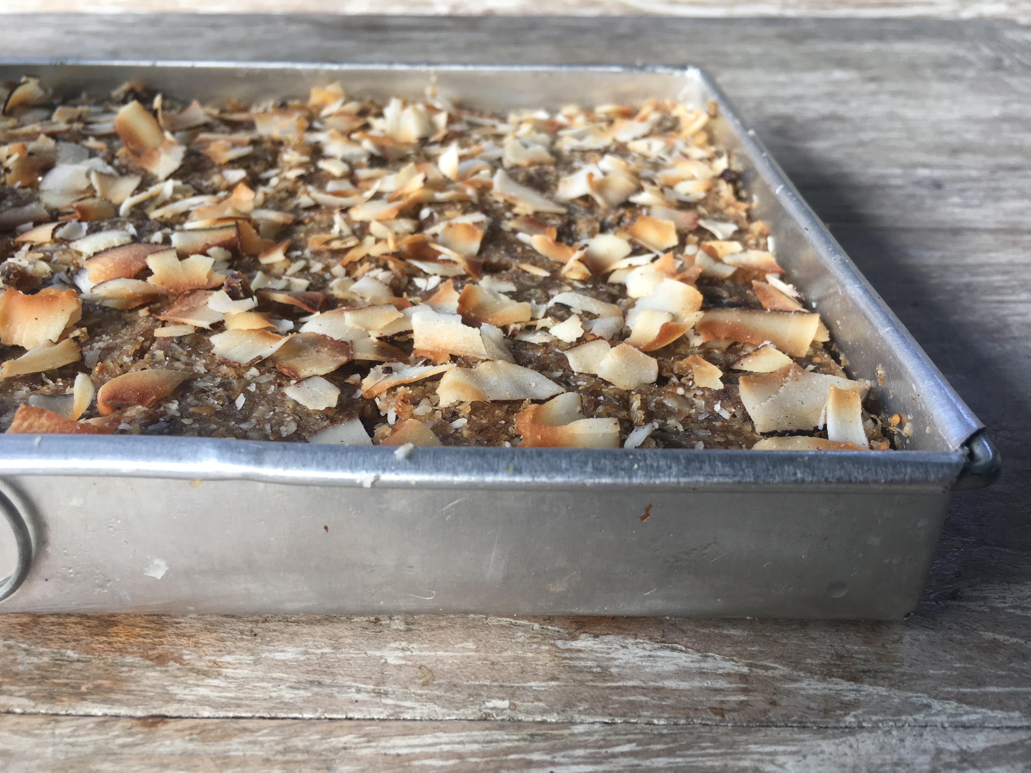 Pour out into a 20cm slice tin and press firmly and even out. Garnish with roasted coconut flakes, or even drizzle with chocolate sauce! Cut slices up into squares. Place in fridge or freezer to set for an hour.