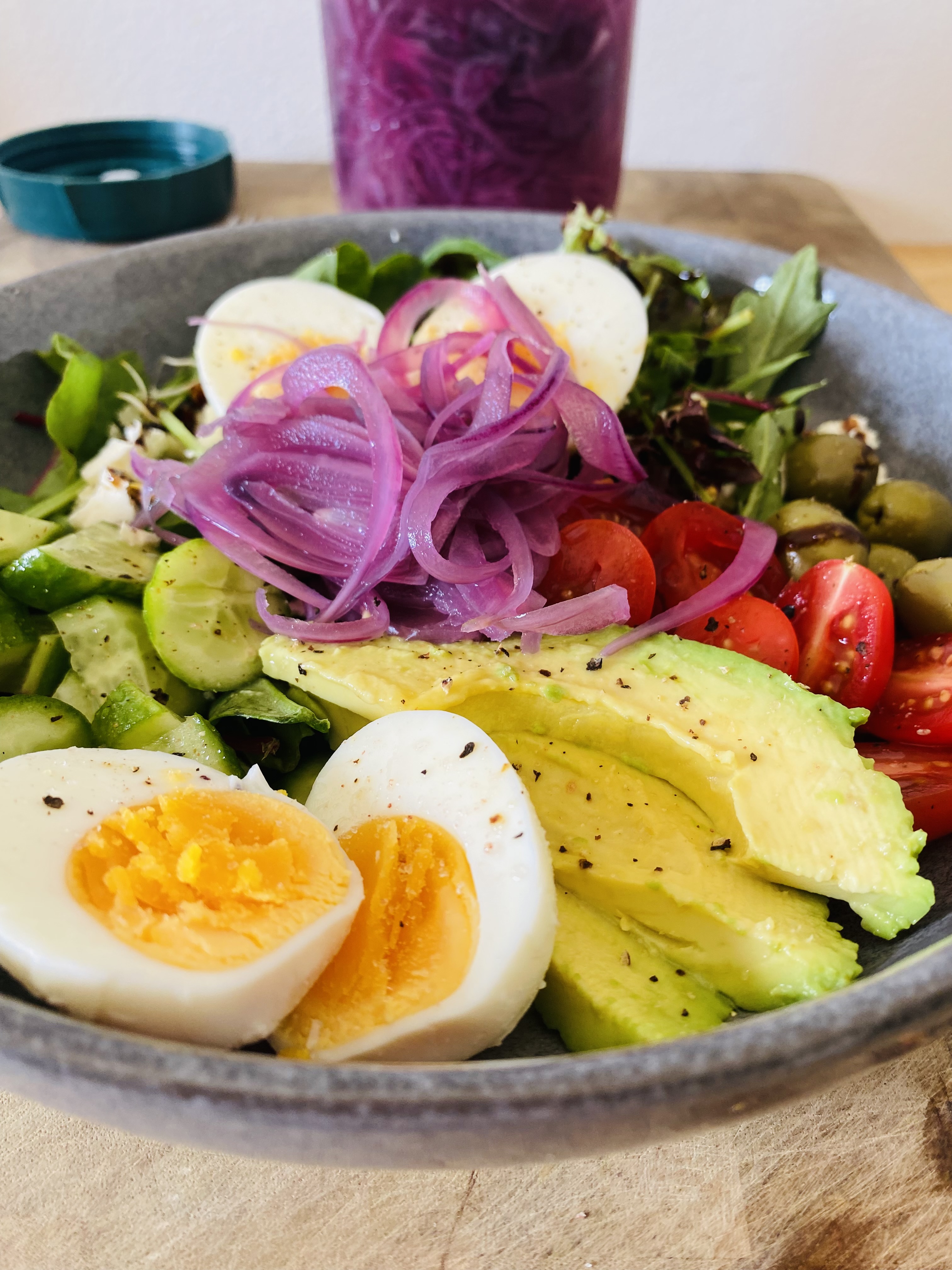 Use the fermented red onions as a delicious color popping topper for tacos, cheese & crackers, with eggs, avo on toast, in dips, salads, potato salad, and keep the brine left over to make a delicious salad dressing!