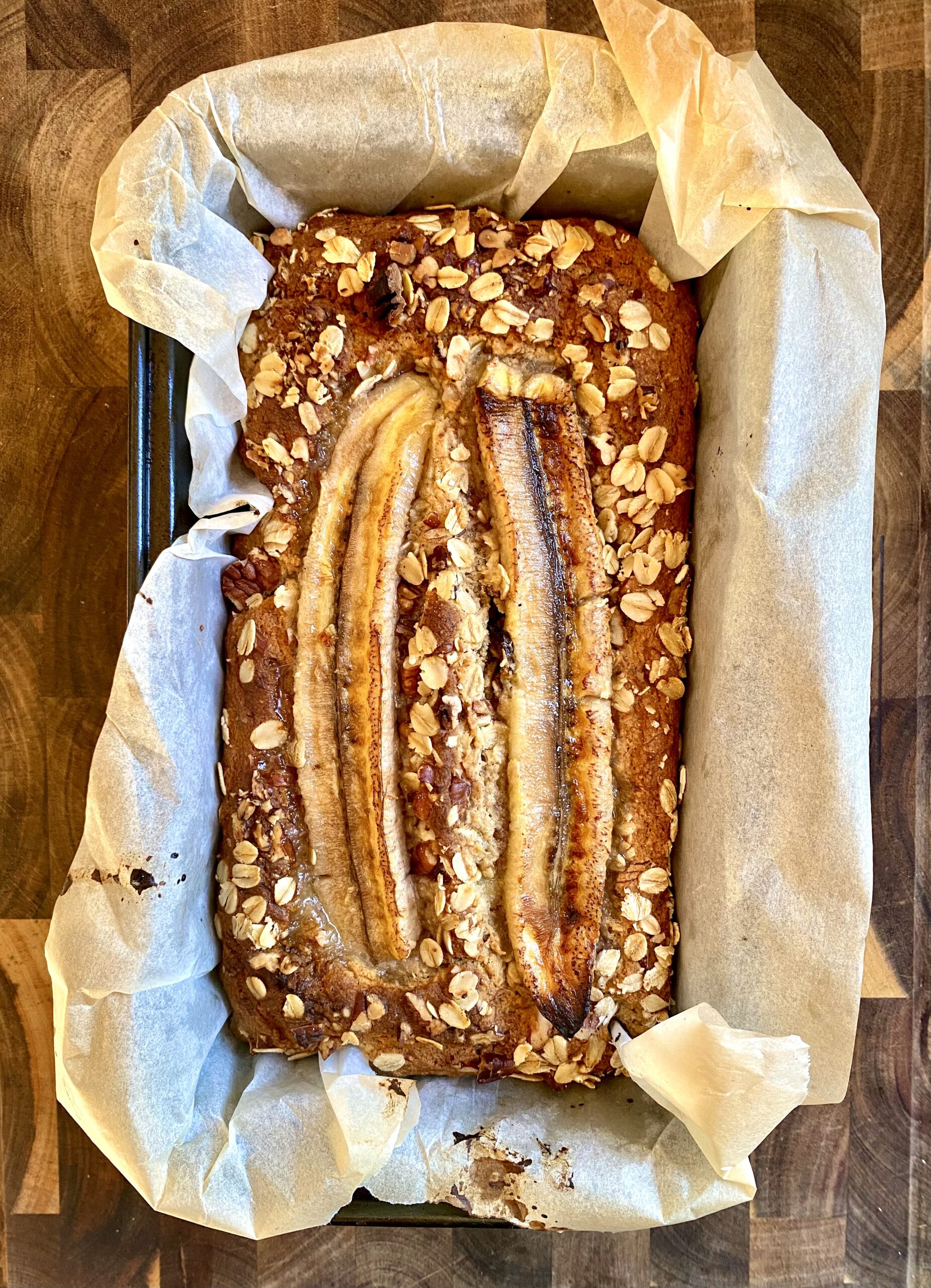 Pour into a baking paper lined loaf tin, top with extra chopped pecans, rolled oats & sliced banana and bake at 180°C for 45 minutes or until skewer comes out clean.