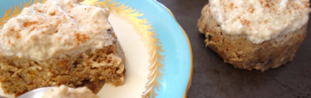 When ready to serve mini puddings, remove from muffin tray and with a spoon, spread “whipped cream” over puddings. Dust with extra mixed spice and serve.