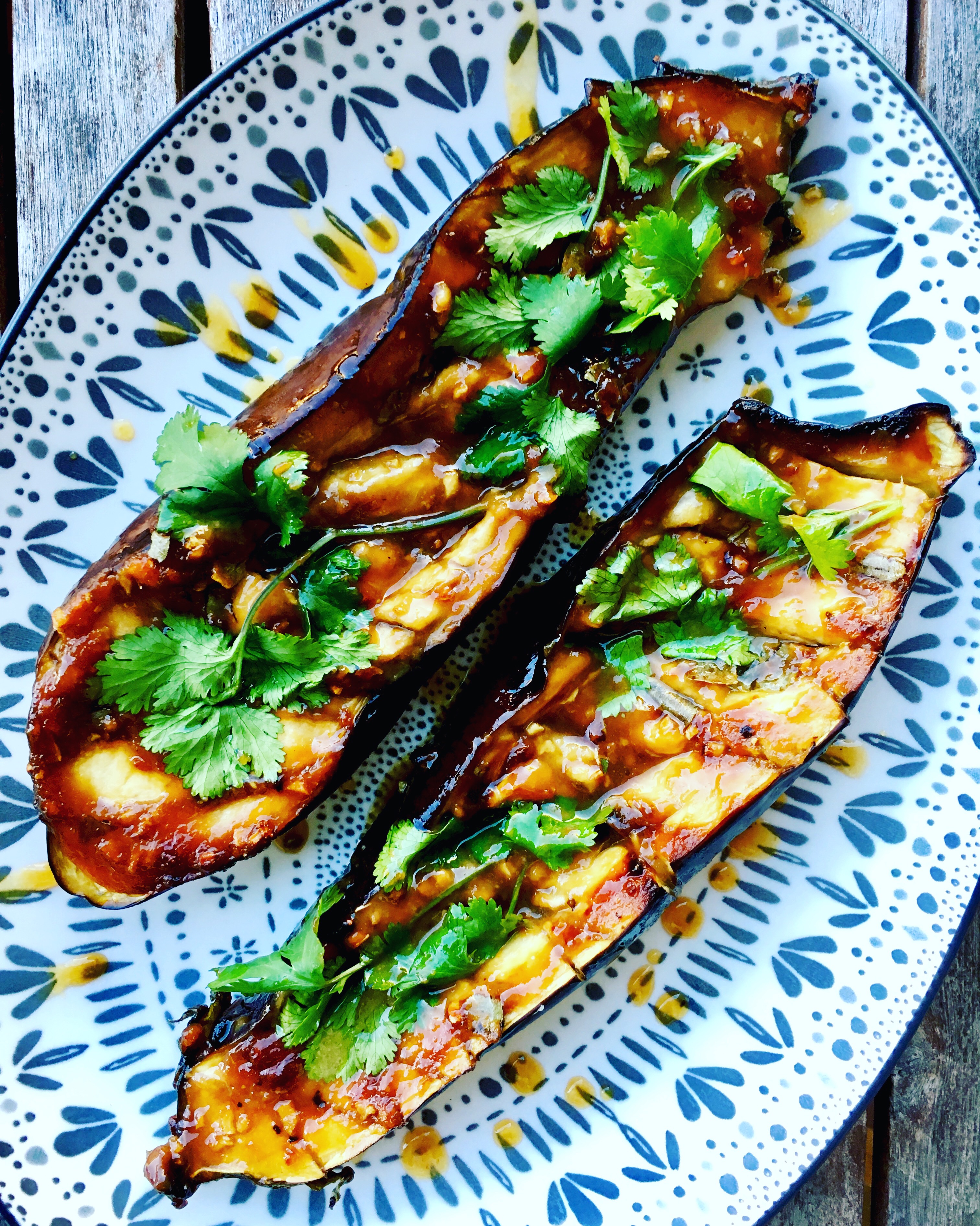 With a spoon, baste these ingredients onto the eggplant generously and place in the oven and bake for 30 mins approx. until soft, and baste once again during cooking time. Before serving baste again and garnish with fresh coriander. Serve with your favourite meal, salad, roast veges curry, or soup.
