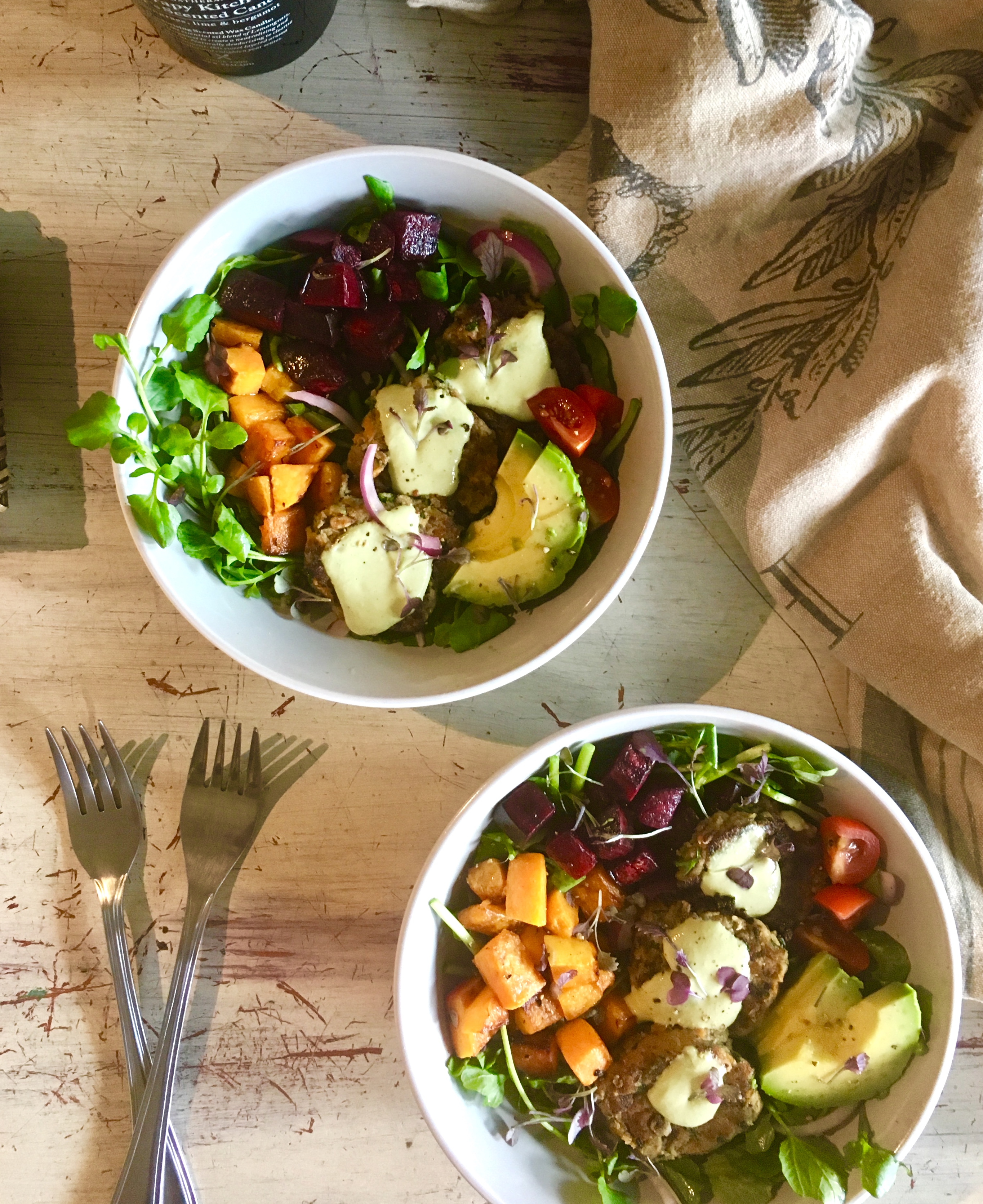 These Vegan Friendly Veggie Patties are delicious with my basil and tahini dressing. Add in some roast beetroot and pumpkin with watercress and you have a super nutrient dense winning salad.